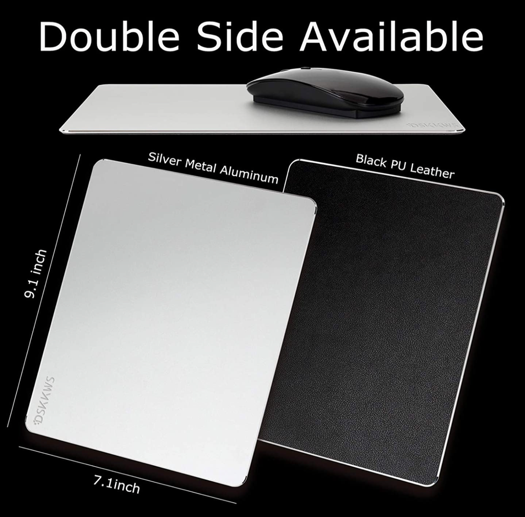 Mantén tu gusto moderno con este mousepad de aluminio color plateado, doble cara. La otra superficie es de piel sintética de color negro cuidadosamente diseñada con líneas pequeñas, puedes elegir cualquier lado para usar. Medidas: 9.1 X 7.1 Pulgadas