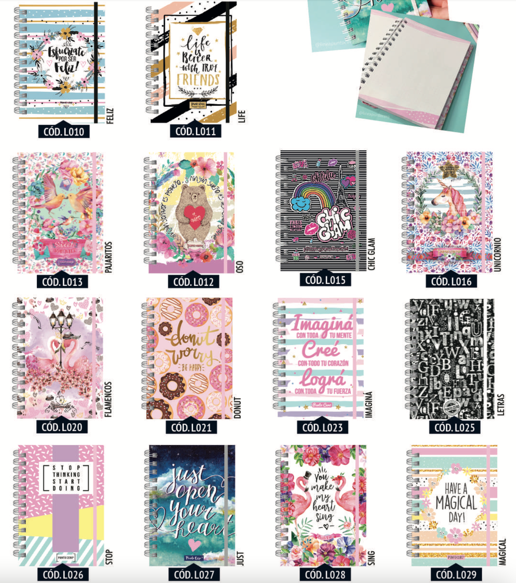 Libreta tamaño 14x19 cm ¡con elástico! Interior impreso en color rosa con puntos guía Contiene 80 hojas de 80 gramos