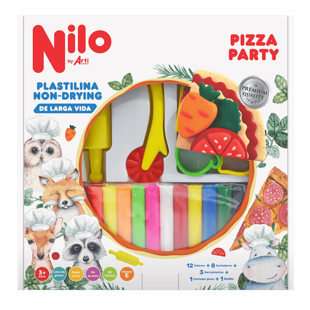 Nilo te trae algo especial para los chefsitos del hogar. Kit de pizza con todos los ingredientes y herramientas necesarias para preparar una deliciosa pizza de plastilina. Cortadores de todas las formas: tomates, pepperonis, queso, piña, tocino, champiñón y mucho más. También incluye 12 barras de plastilina de todos los colores. Vida útil de aproximadamente 3 años. No te preocupes si lo dejas fuera de su envase o a la intemperie porque no se seca. Es Libre de gluten, no es tóxica y contiene Vitamina E, la cual actúa como antioxidante, nutre la piel y restaura la humedad.