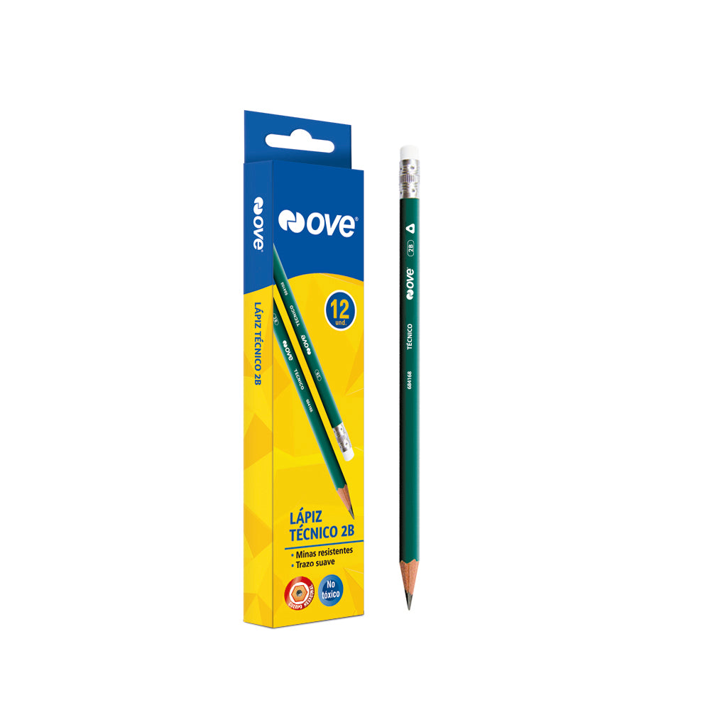 Lápiz Tecnico 2B con borrador con minas resistentes, trazo suave.