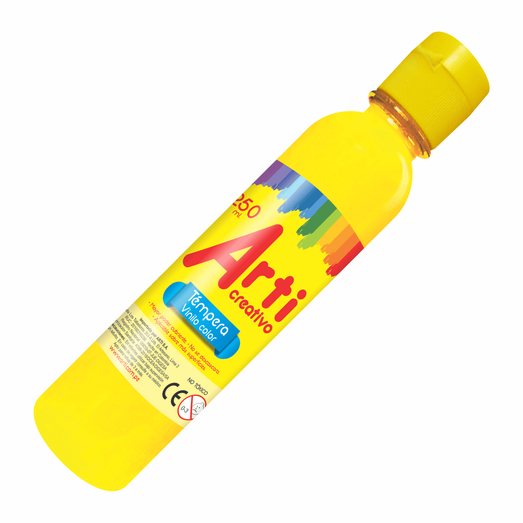 Tempera Amarilla X 250ml Arti. Ideal para pintar sobre tela, cuero, madera, lienzo, cemento, ladrillo y cerámica. Puede ser diluido en agua. Mayor poder cubriente. Tapa flip top. No tóxicos.