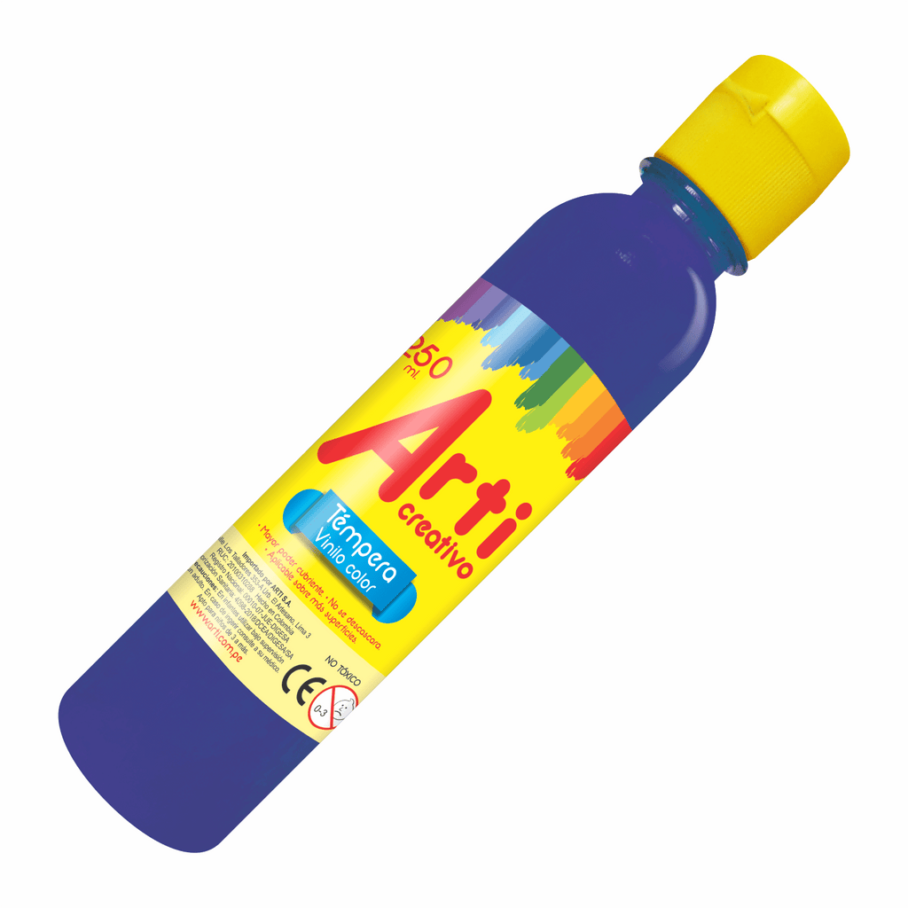 Tempera Azul X 250ml Arti. Ideal para pintar sobre tela, cuero, madera, lienzo, cemento, ladrillo y cerámica. Puede ser diluido en agua. Mayor poder cubriente. Tapa flip top. No tóxicos.