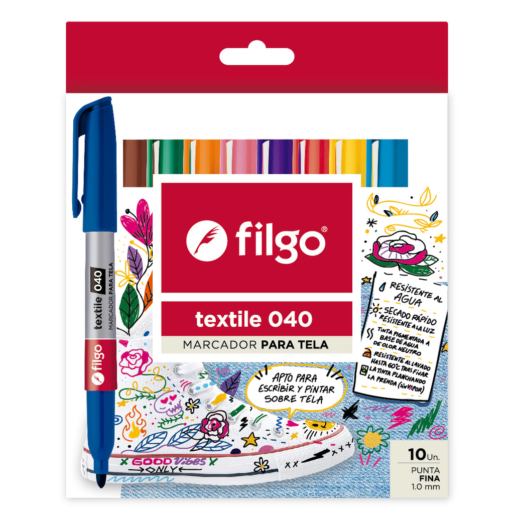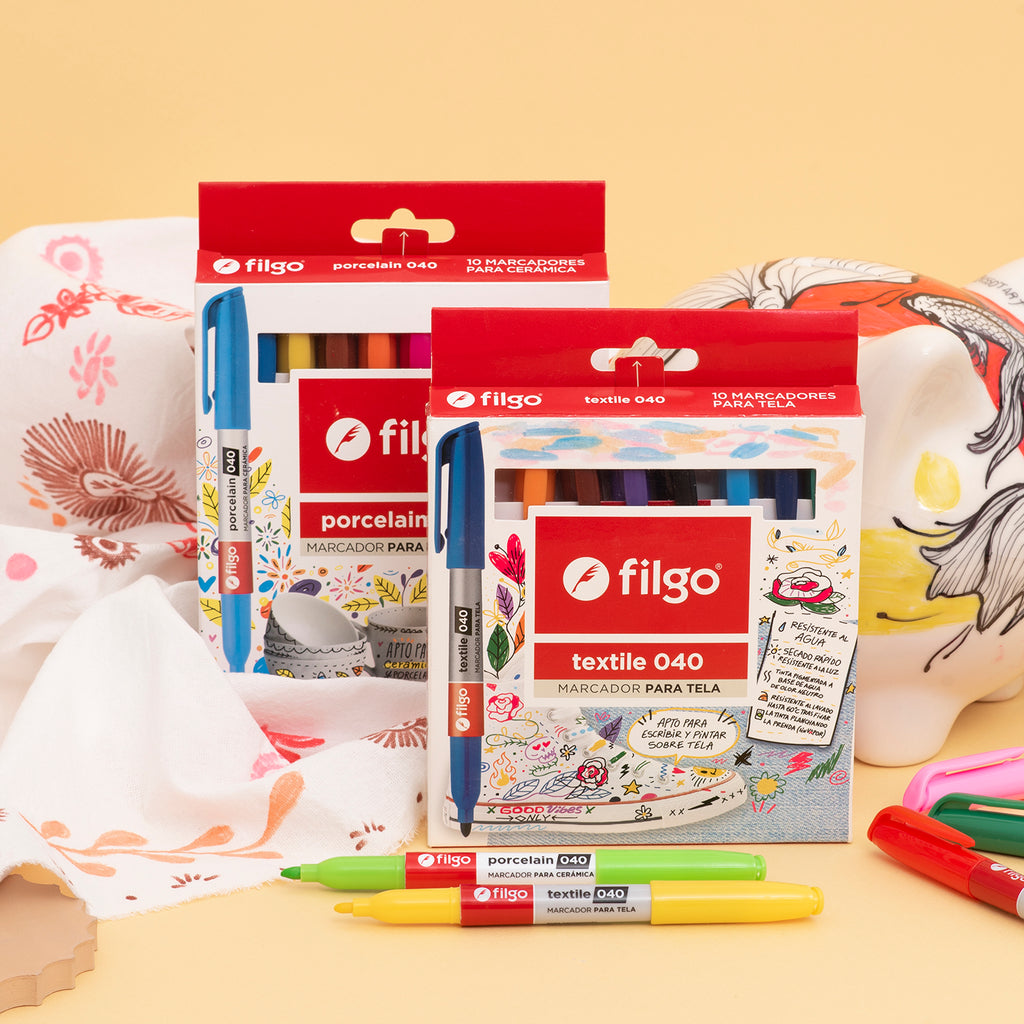 Decora o rotula tus prendas con los marcadores para porcelana de Filgo. Su tinta es a base de alcohol, sin xyleno ni tolueno y apto para tela.  El set contiene 10 colores brillantes surtidos.